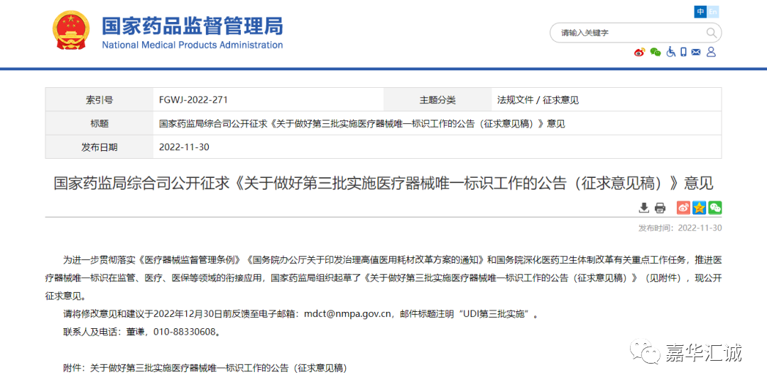请将修改意见和建议于2022年12月30日前反馈至电子邮箱:mdct@nmpa.gov.cn,邮件标题注明“UDI第三批实施”。