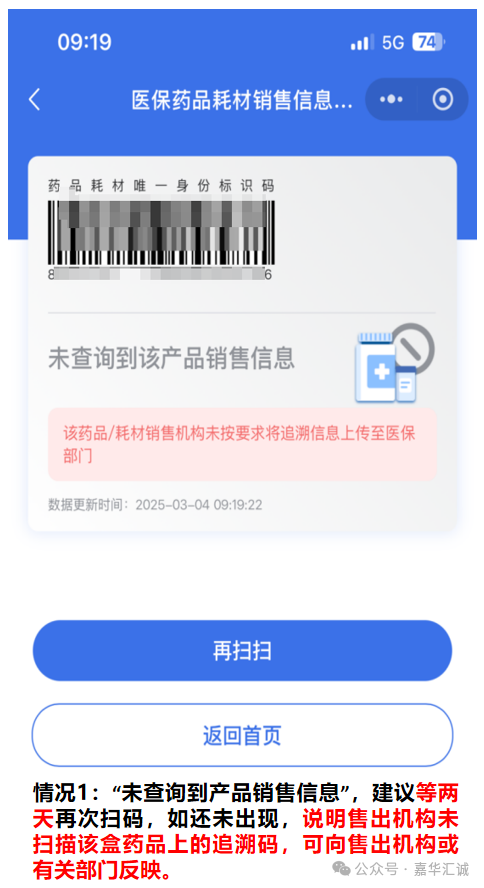 情况1:“未查询到产品销售信息”,建议等两天再次扫码,如还未出现,说明售出机构未扫描该盒药品上的追溯码,可向售出机构或有关部门反映。