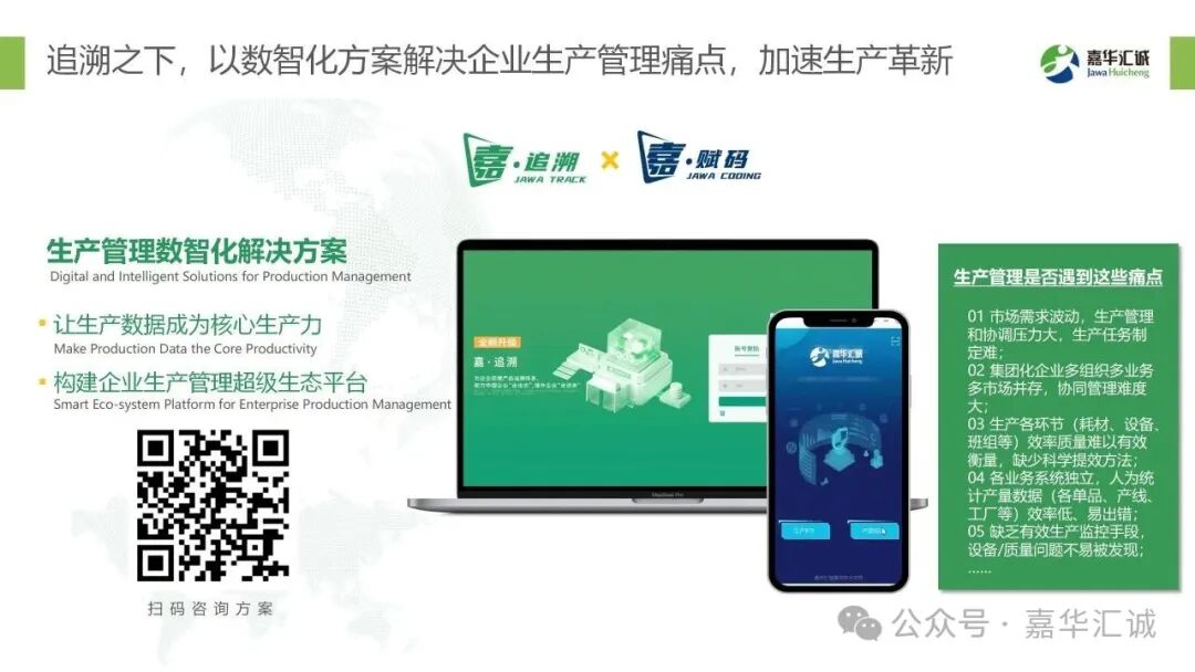 "嘉·追溯+嘉·赋码"为企业搭建生产管理数智化系统平台,具备多组织多工厂集团化统一管理、多维度生产数据统计分析、多行业多业务多市场统一管理、产线运行动态可视化、内外部多异构系统快速桥接、产销协同数智化、多端联动等核心功能,通过实时采集、深度挖掘生产数据价值,整合全链条产销信息,为企业战略决策提供精准数据依据,有效推动企业降本增效、提升产品质量与市场竞争力,赋能企业在数字化浪潮中实现高质量发展。