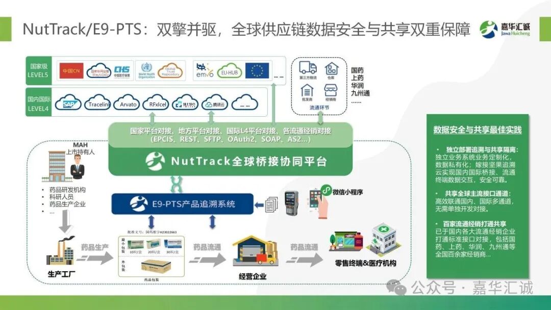 经营流通企业可通过NutTrack云平台与国家医保、各省药监平台、第三方追溯平台、二级节点及更多医疗机构和配送商系统实现"总对总"对接,高效灵活低成本,用统一配置的范式实现对多平台数据桥接和统一管理;E9-PTS私有化部署系统支持与内部WMS、ERP等系统快速融合,进行实时追溯数据核验或信息绑定,实现个性化功能定制及数据沉淀,支持多业务模式多组织单位统一管理,让供应链数据互通与业务协同效率有效提升;「嘉·赋码」产品及服务为物流/经营/门店等不同业务场景的产品包装再关联、产品追溯码数据批量采集及核验提供解决方案,有效提高各环节扫码核验、收货验收等作业效率。