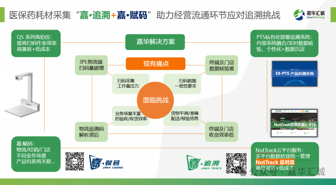 在经营流通环节,面对医保药耗采集需求,针对经营物流端扫码量剧增、追溯码解析滞后、终端及门店核验难、收货效率低等问题,嘉华「药械同追+双擎并驱」一站式解决方案,助力经营流通环节企业更高效完成追溯系统升级,灵活应对不确定的外部环境、快速响应药监医保监管要求。